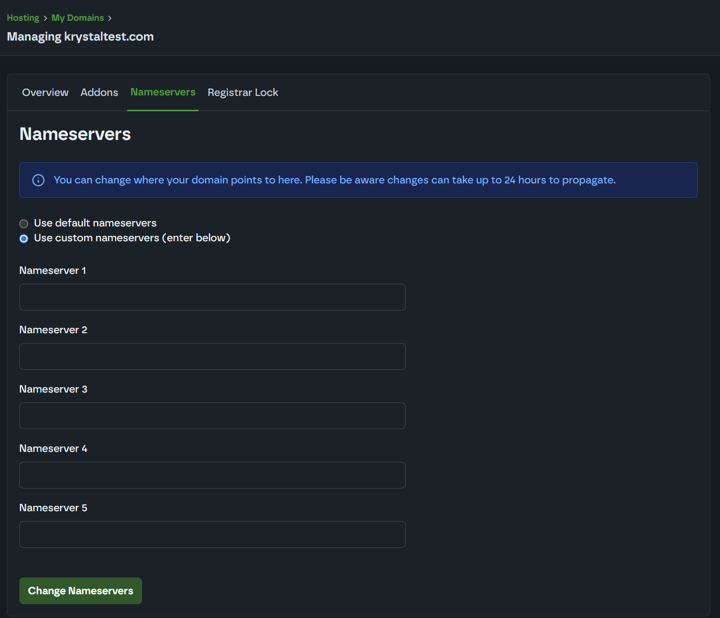 Remember to click Change Nameservers when finished. Updates can take up to 24 hours to fully propagate globally.