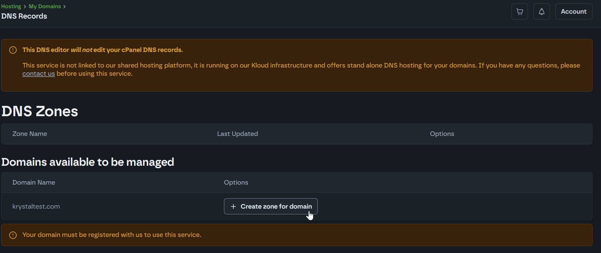 If you see “domain is not yet setup for DNS,” click Create zone for domain.