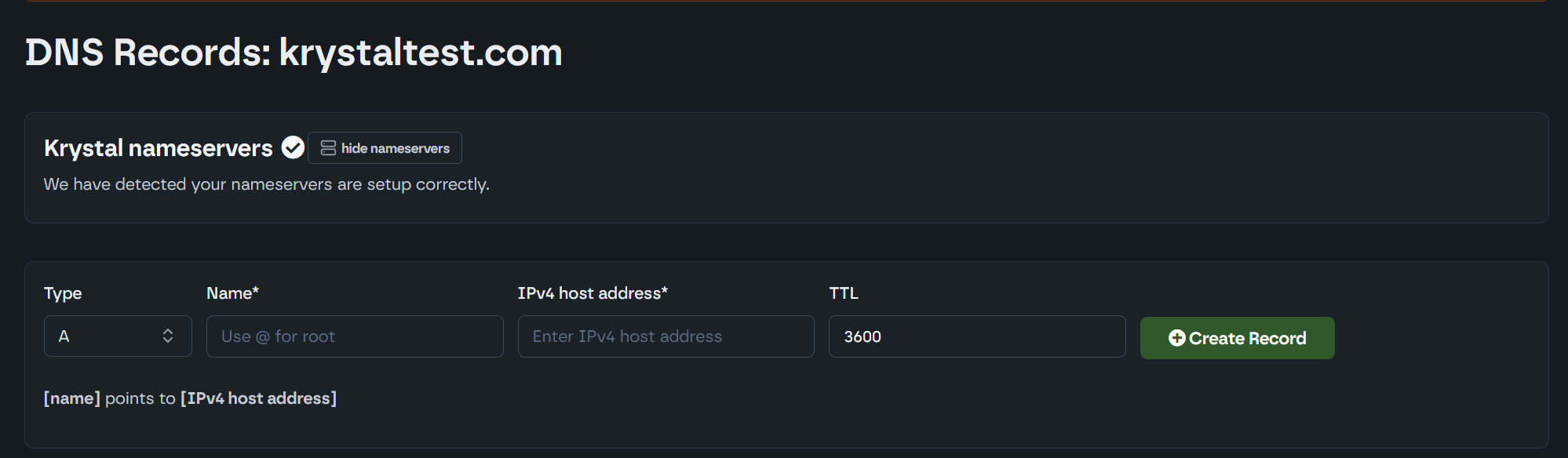 Enter the Name (often “@” for the root domain) and the Hostname or IP address you want to point to.