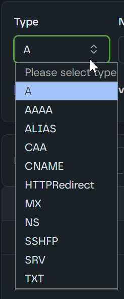 Choose a Type (A, CNAME, MX, etc.).