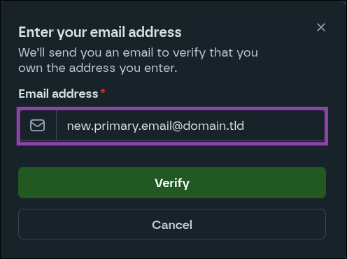 - Enter your new email address and click the "Verify" button.