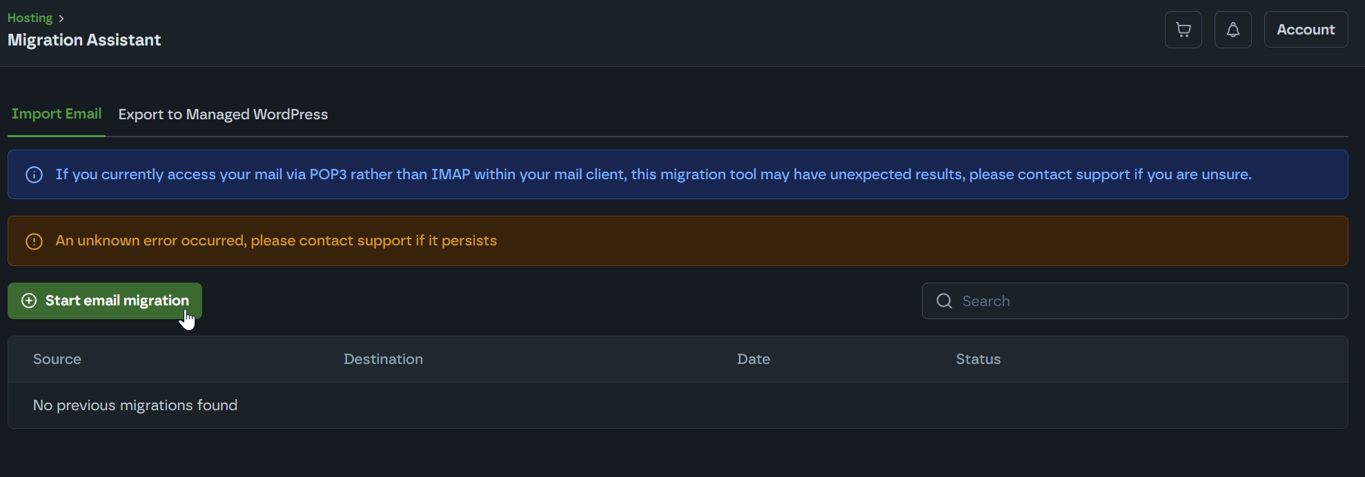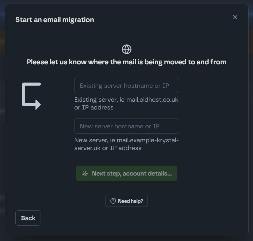 You can sync mail between different email accounts on our servers and also sync email in from addresses elsewhere. The tool can only be used to sync in to Krystal.Once you've entered the Source & Destination information click Start email migration. The Destination information can be obtained from your 'New account information email' and will be the hostname of the server you have been placed on. If you are unsure or can no longer find the e-mail, you can contact our support team for clarification.
