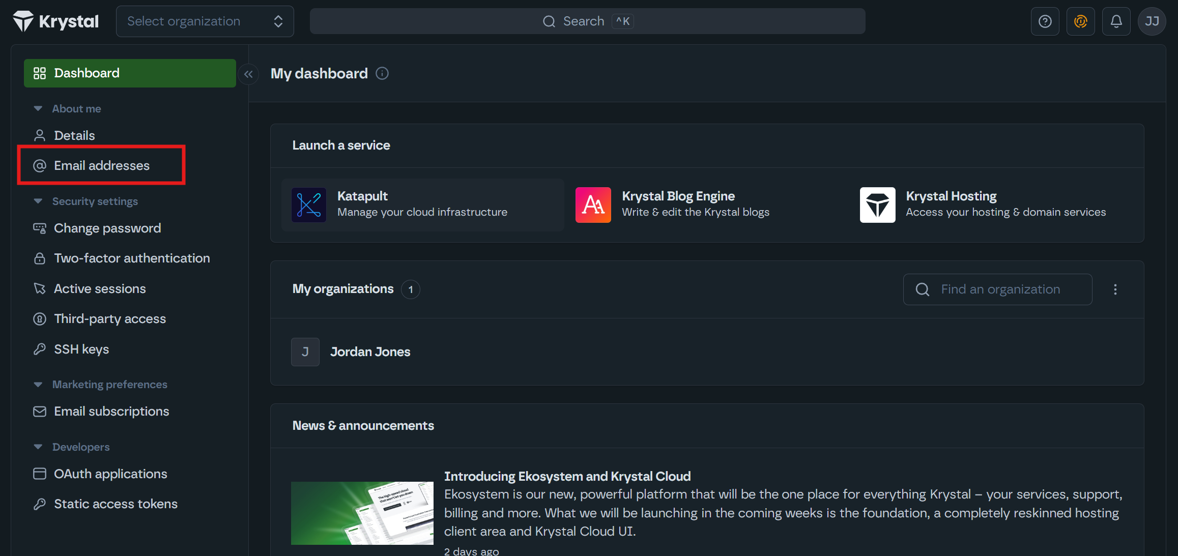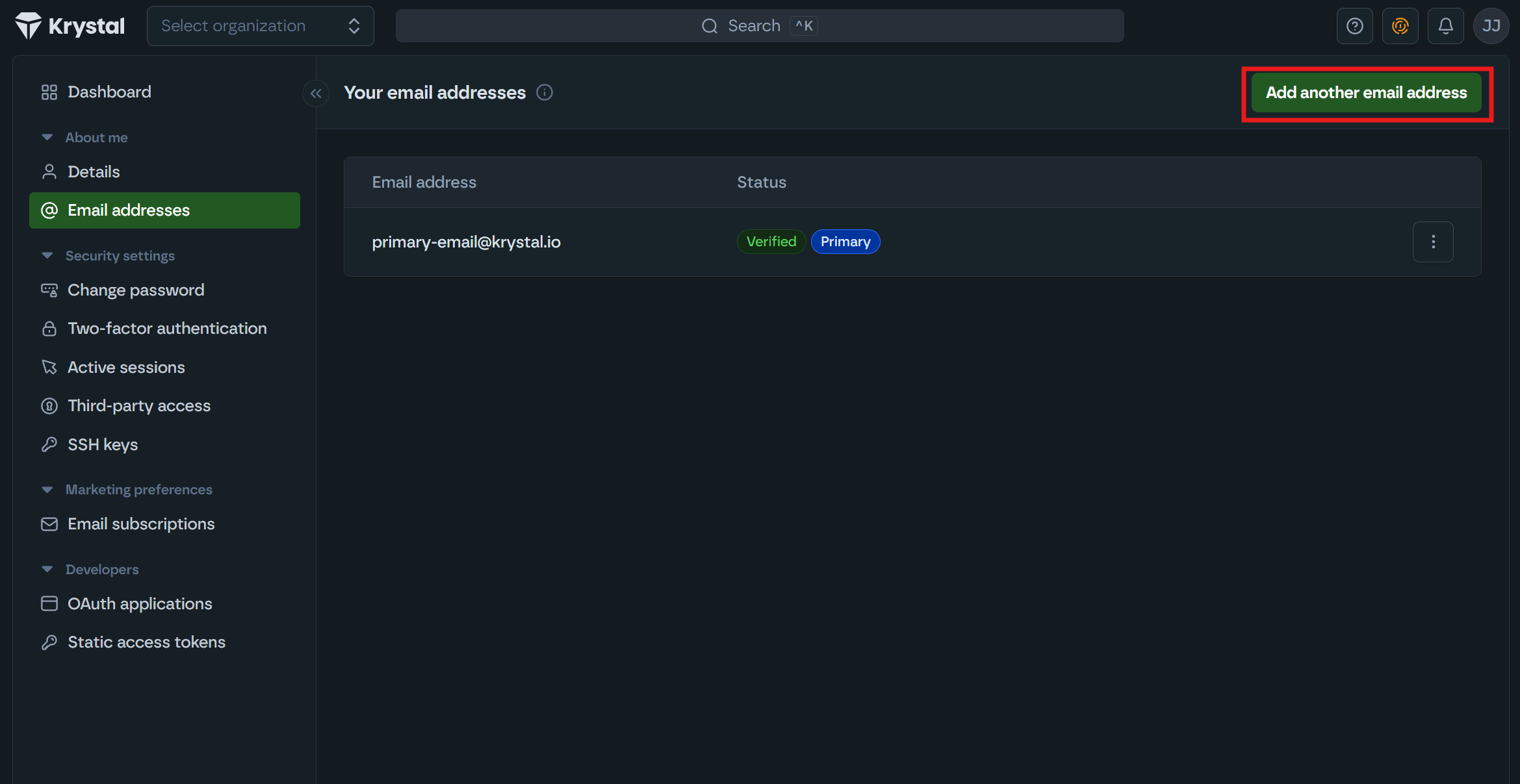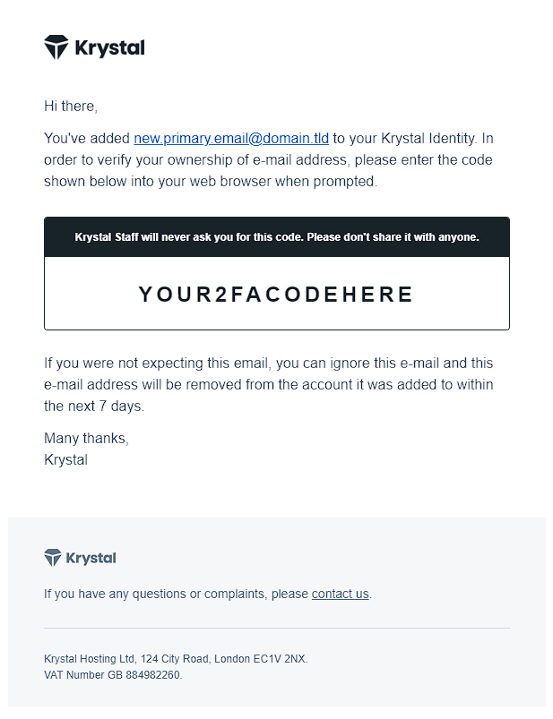 Your Krystal Identity email address is used for logging in and receiving important account notifications such as invoices and renewals. You can update it at any time from your account settings. If you no longer have access to the email address on file, our support team can help.