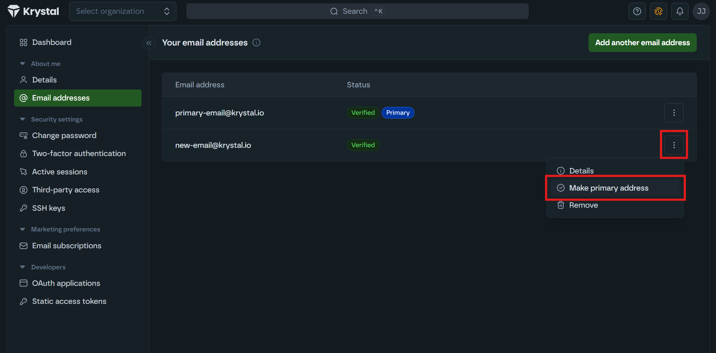 - Once added, click the three dots next to the new email address and select Make primary address.