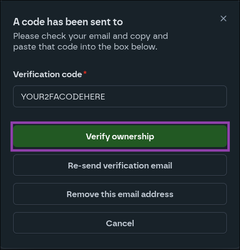 - Paste the verification code into the form and click the "Verify ownership" button.